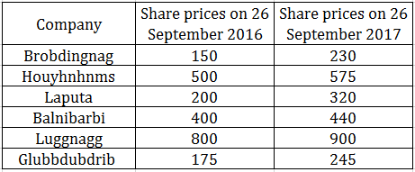 2. If Mr. WB had purchased a total of 60 shares of exactly 4 of the 6 companies, then the maximum possible percentage return on investment as on 26 September 2017 based on the shares of these 4 companies only could be (answer should be accurate up to two digits after the decimal point)